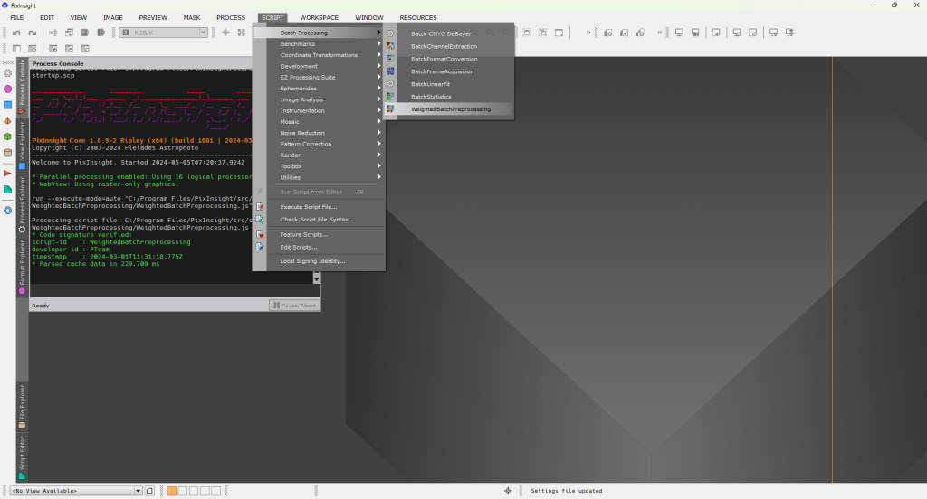 Snímky máme protříděné, ve čtyřech složkách: Light, Dark, Flat, Bias. Pokud nefotíte Bias snímky, ale DarkFlaty, složku si pojmenujte třeba DarkFlat. Nastal čas otevřít PixInsight, v něm záložku Scripts => Batch Processing => WeightedBatchPreProcessing, což je kryptický název pro skript, který umí mimo jiné i stackovat snímky :-).