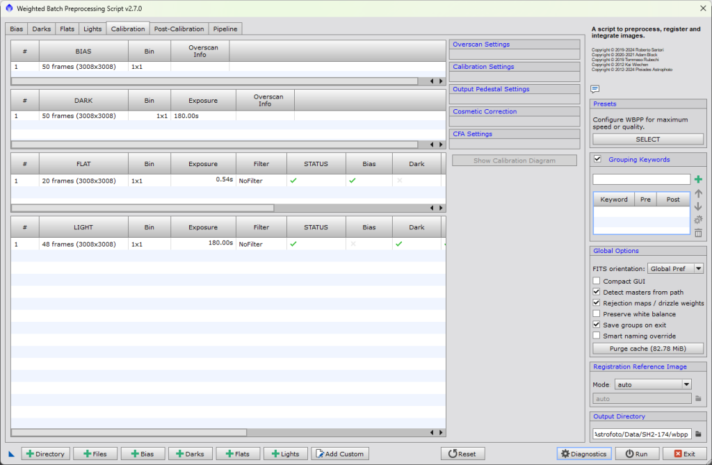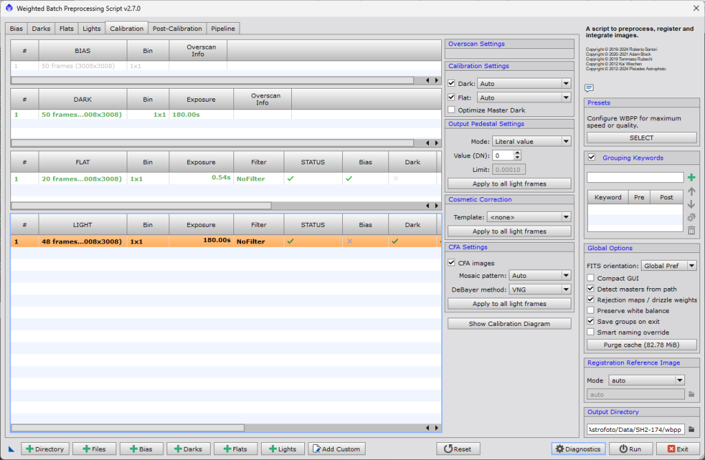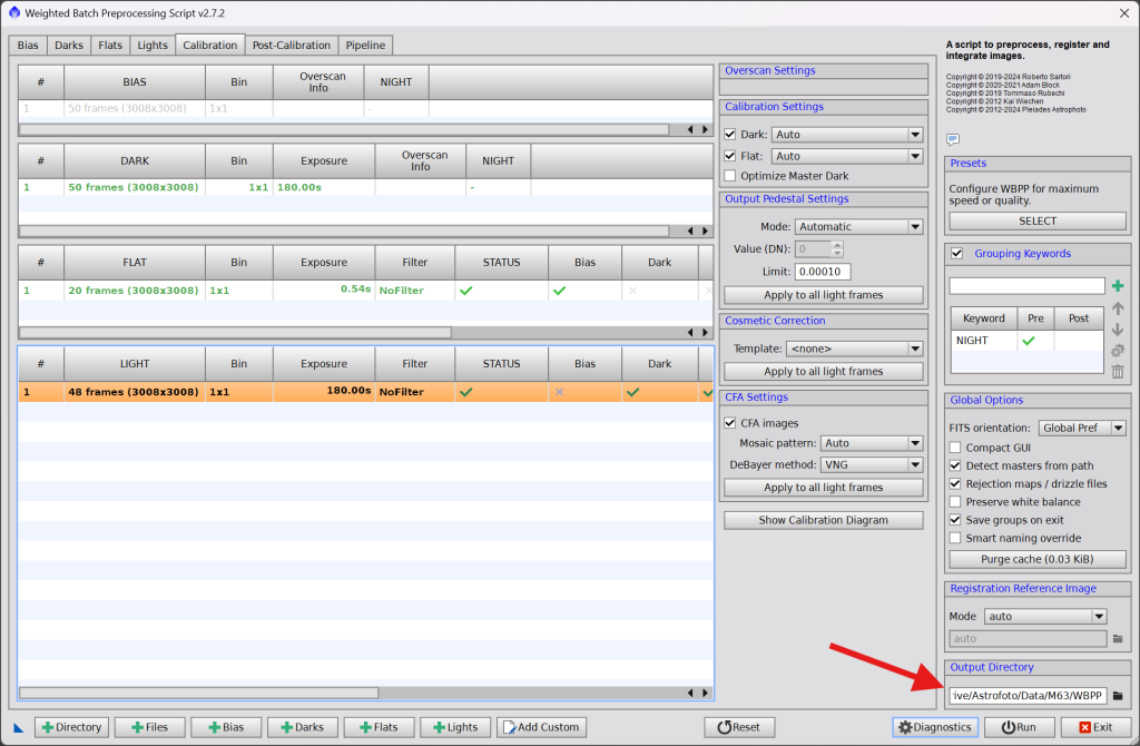 Zde v ideálním případě nebude nutné nic měnit. Máme zde shrnuté všechny typy snímků, co jsme načetli do skriput. Zkontrolujte, že vše sedí. u Light snímků na panelu vpravo zkontrolujte, zda je zaškrnuto CFA images pokud jsou vaše snímky barevné. Pokud nejsou, naopak CFA nesmí být zaškrnuto.