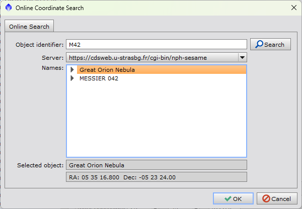 Souřadnice objektu můžete vyhledat pomocí tlačítka Search, do okna, co se otevře, zadáte název (kód objektu) a PixInsight si souřadnice najde v online katalogu.