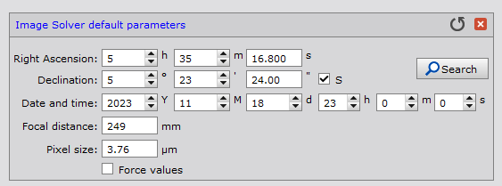 V sekci Astrometric Solution klikneme na Image Solver parameters… a zkontrolujeme zda jsou pole správně vyplněná. PixInsight při průběhu stackování analyzuje snímky a provádí „plate solving“, potřebujeme mít správně vyplněné souřadnice objektu, ohniskovou vzdálenost dalekohledu, velikost pixelů snímače a datum (čas nemusí být přesný). Pokud používáte jakýkoliv specializovaný software pro focení DSO (ASIAir, KStars, N.I.N.A…), budou tyhle informace obsaženy v TIF hlavičkách Light snímků, přesto je ale zkontrolujte a případně opravte, často se stává, že si PixInsight pamatuje data z posledního stackování, která ale těm současným neodpovídají. Pokud se plate solve během stackování nezdaří, PixInsight vás v průběhu vyzve k zadání těchto informací znovu.
