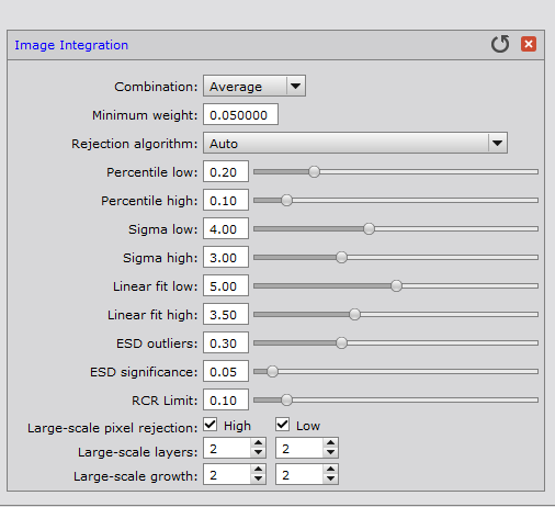 V Image Integration chceme jen zakliknout Large-scale pixel rejection, sami vývojáři to doporučují od doby, co po obloze létají hromady Starlinků apod. Výsledek bude lepší odstranění stop satelitů a letadel ve složeném snímku.