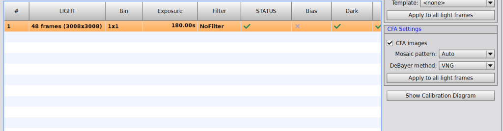 Jestli jste vložili barevné Light snímky a musíte CFA images zaškrtnout ručně, vyberte raději ručně i Mosaic pattern, dle druhu Bayerovy masky vaší kamery.