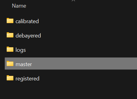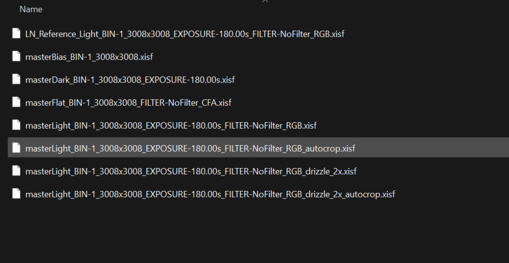 Konkrétně soubor masterLight_BIN-1_3008x3008_EXPOSURE-180.00s_FILTER-NoFilter_RGB_autocrop.xisf představuje složený snímek, který byl zároveň ořezán do takové oblasti, kterou mají všechny snímky společnou (např. kvůli ditheringu a ujíždění montáže se pozice objektů napříc jednotlivými snímky mírně liší).