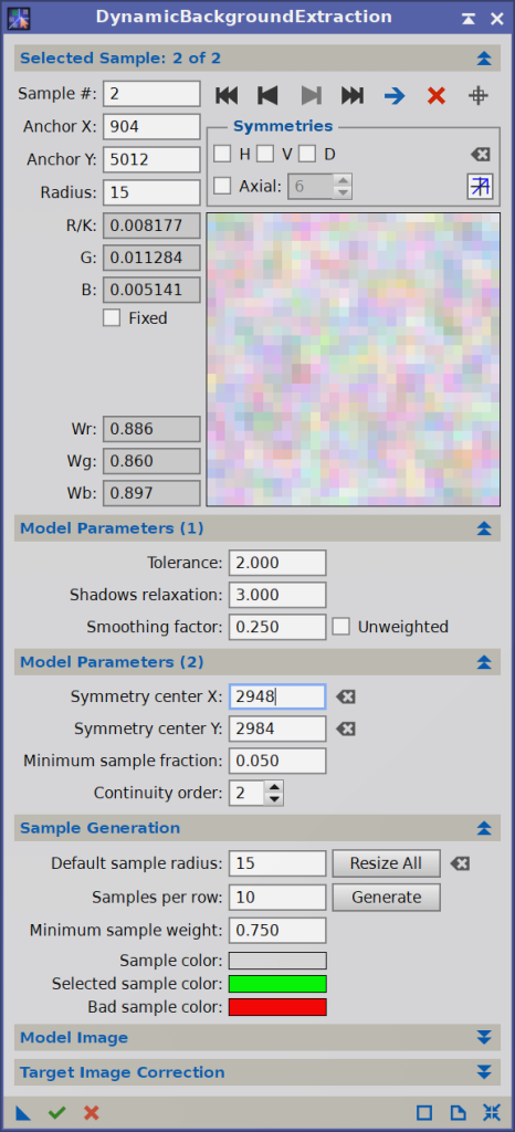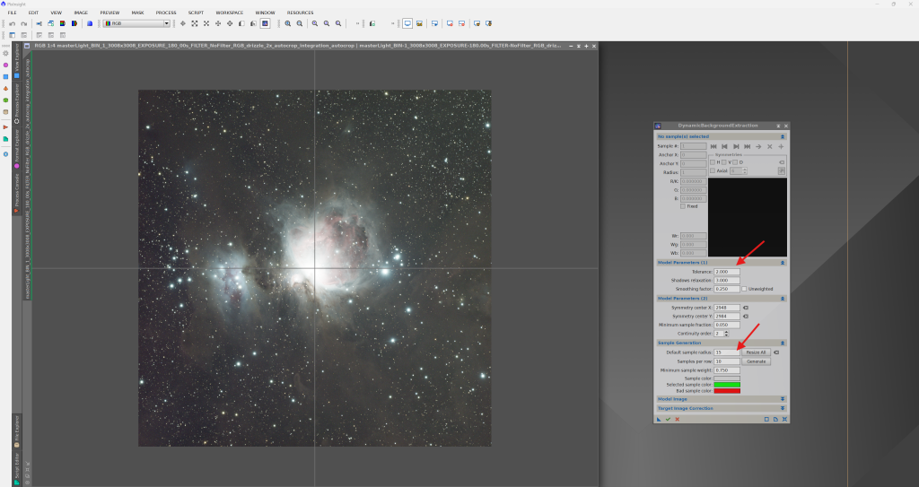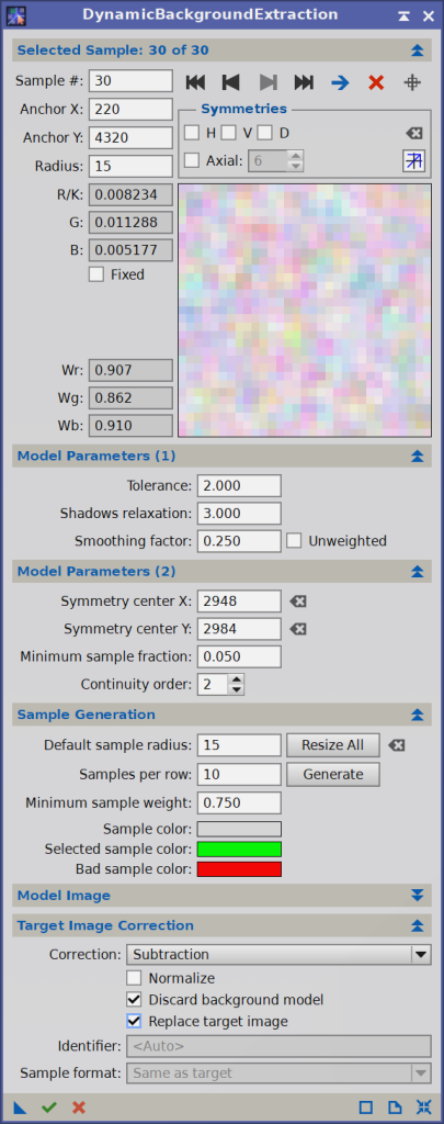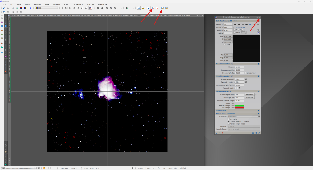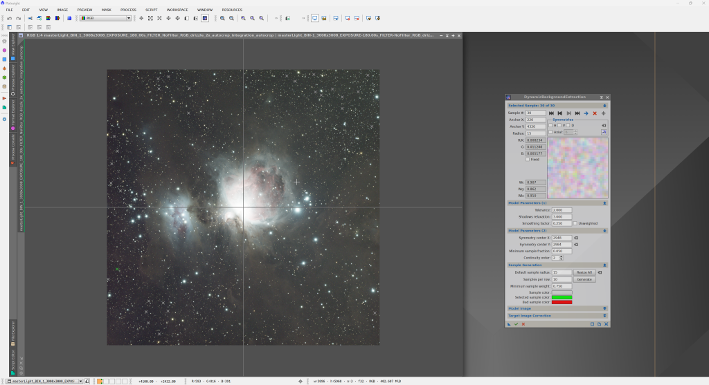 První proces zahrnuje poměrně hodně ruční práce, otevřeme ho ze záložky Process => DynamicBackgroundExtraction. Po otevření okna procesu klikneme kamkoliv do obrázku a trochu upravíme nastavení. Proces funguje tak, že ručně vyklikáme místa v obrázku, kde se nevyskytuje žádná mlhovina ani hvězdy – tedy opravdu pouze pozadí.