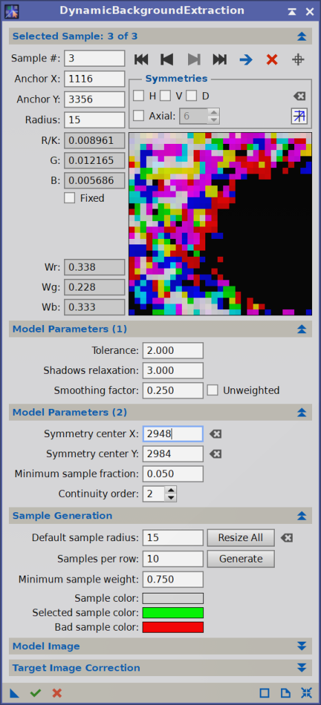 Hodnoty nastavení, které zvýrazňuji se pro vás mohou lišit. Nicméně se jedná o toleranci „nedokonalosti“ pozadí a velikost jednotlivého bodu, berte to jako výchozí bod, ze kterého můžete začít a nastavení upravit dle potřeby. Naším cílem je teď naklikat aspoň 30 bodů co nejvíce rovnoměrně uvnitř obrázku, kde se nachází pouze pozadí, dávejme si prosím pozor na temné mlhoviny o které bychom mohli tímto způsobem přijít. Je důležité se jim vyhnout.