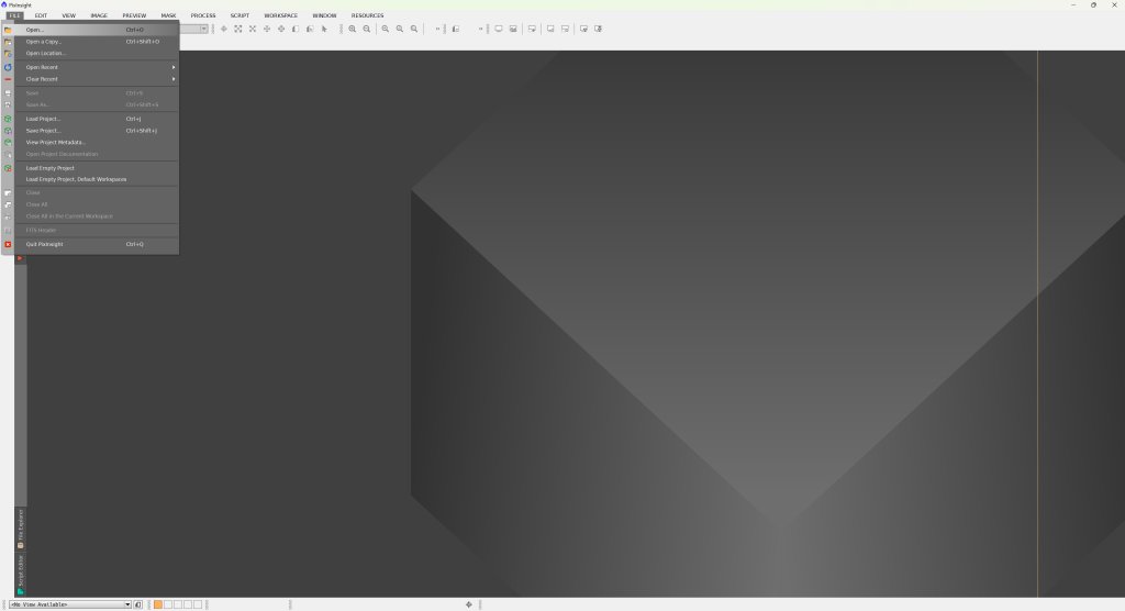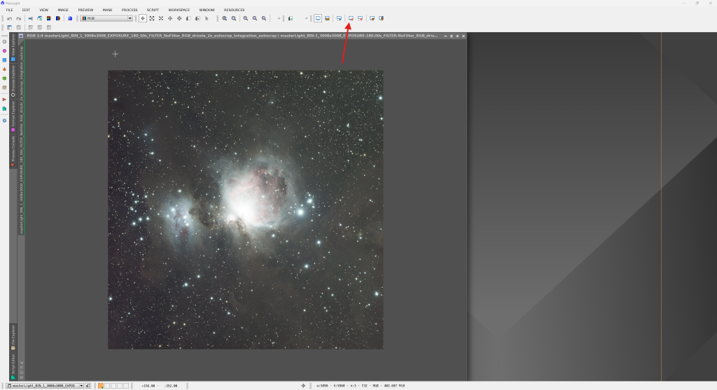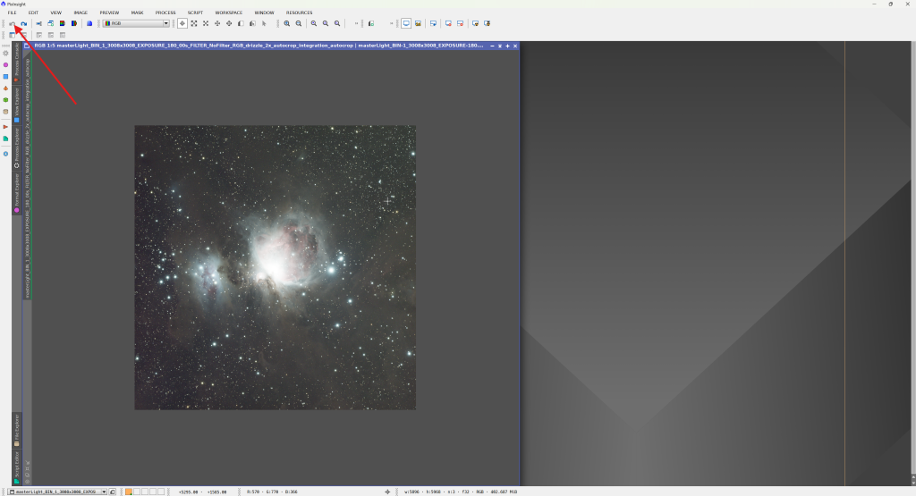 Nyní můžeme konečně otevřít náš složený snímek z minulého dílu. Učiníme tak kliknutím na kartu File => Open. Poté stačí najít adresář kde máme výsledky z WBPP a otevřít soubor masterLight……xisf, jak jsme si již řekli na konci předchozího dílu.