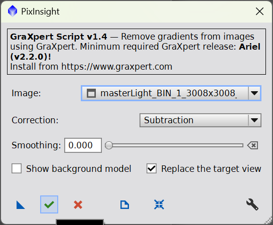 Není třeba nic měnit, stačí stisknout zelenou faječku ✔️, pokud dojde k problému zkontrolujte přes tlačítko nastavení vpravo dole, že máte správně nastavenou cestu k instalaci GraXpertu, jiný problém by nastat neměl.
