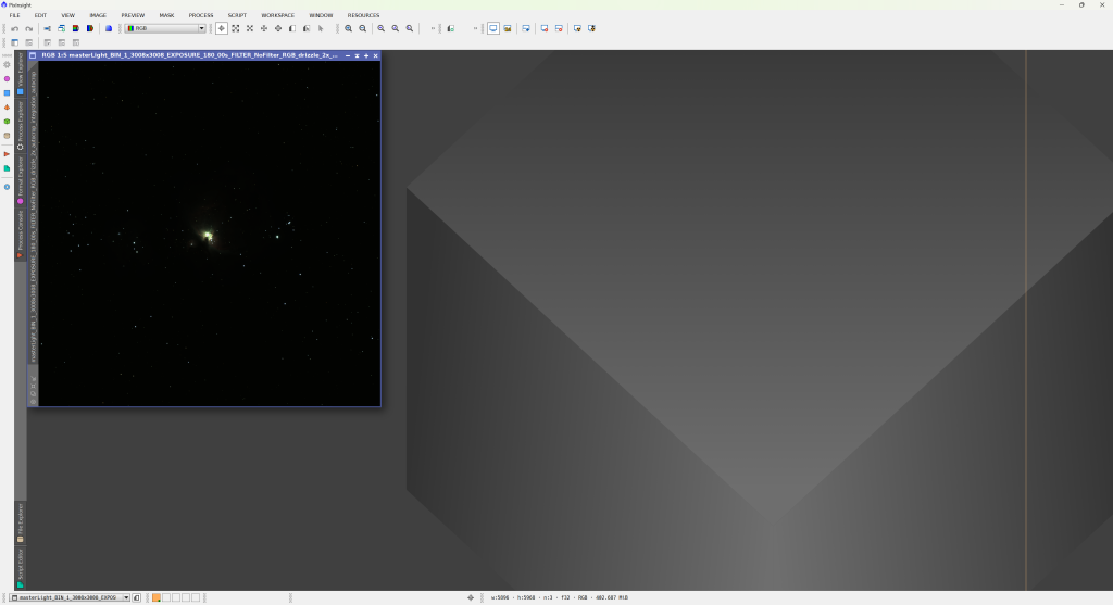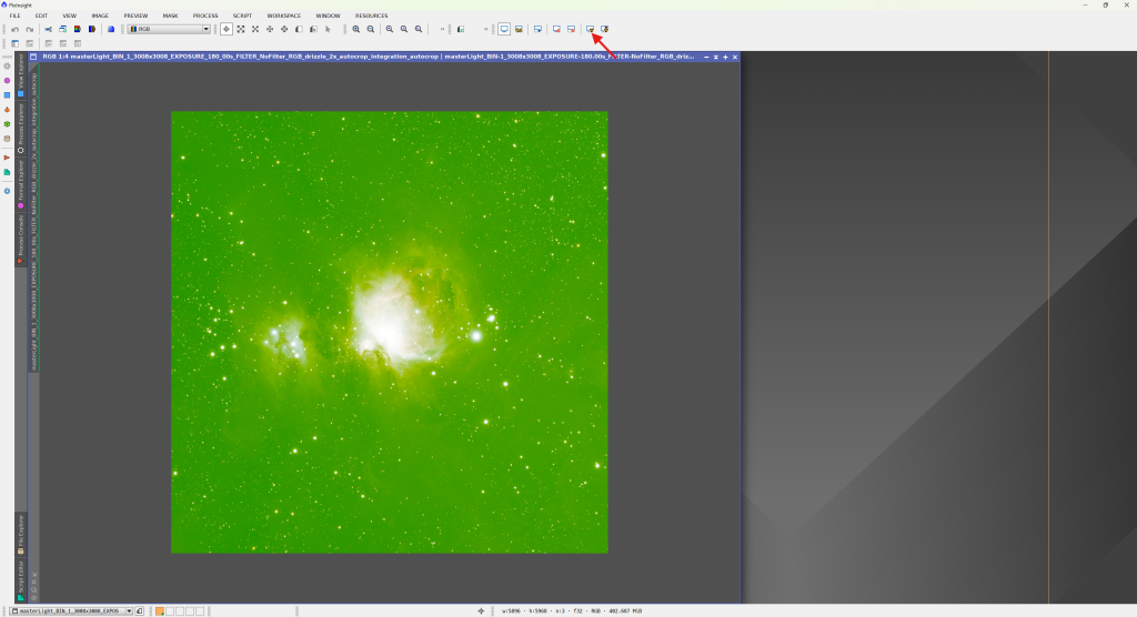 PixInsight nám čistě pro účely zobrazení upravil histogram, tak abychom něco viděli. Fyzicky v obrázku nezměnil vůbec nic, data se nijak nezměnila. Funkce má název STF AutoStretch. Obrázek je viditelně velmi zelený, je to dáno tím, že barevné kamery zaznamenávají 2x více zelené než ostatních barev, není to pro nás žádný problém, stačí na tlačítko znovu kliknout se zmáčknutým CTRL a AutoStretch automaticky barevné kanály vyrovná, k původnímu vzhledu se lze vrátit podržením Shift a kliknutím.