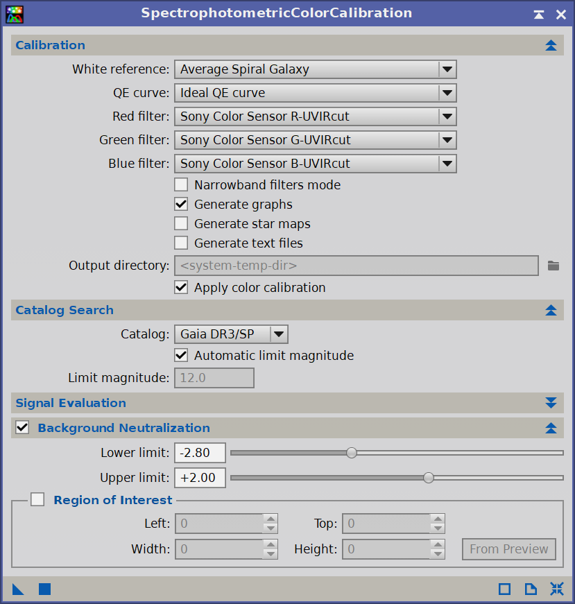 Důležité jsou pro nás políčka Red, Green a Blue Filter. V rozbalovací nabídce vyberete druh vašeho senzoru a použitý filtr. Já fotil přes ZWO ASI533MC Pro s UV/IR cut filtrem, tato kamera používá Sony senzor, tedy výběr je přesný. Pokud jste použili nějaký filtr proti světelnému znečištění nebo nějaký úzkopásmový, dost možná v nabídce je na výběr a pokud není, lze ho přidat ručně, návod na to najdete někdy v budoucnu třeba na těchto stránkách. Klidně můžeme odškrtnout políčko Generate graphs, není to podstatné, poté stačí trojúhelníček z levého dolního rohu přesunou do obrázku a dojde ke kalibraci barev.