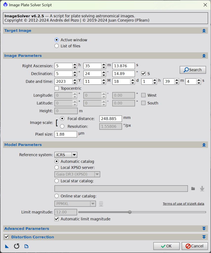 Přes tlačítko Search, vyhledejte objekt, který je na snímku – tím se vám doplní souřadnice, poté správně vyplňte datum, Focal distance (ohniskovou vzdálenost dalekohledu) a Pixel size. Všimněte si, že Pixel size je v mém případě 1.88px, to je tím, že na obrázek byl aplikován Drizzle x2, který 2x zmenšil velikost pixelů, jinak je velikost u mé kamery 3,76 mikrometru. Poté stačí kliknout na OK, dojde k astrometrické analýze snímku a můžete znovu spustit SPCC, už by neměl nastat žádný problém.