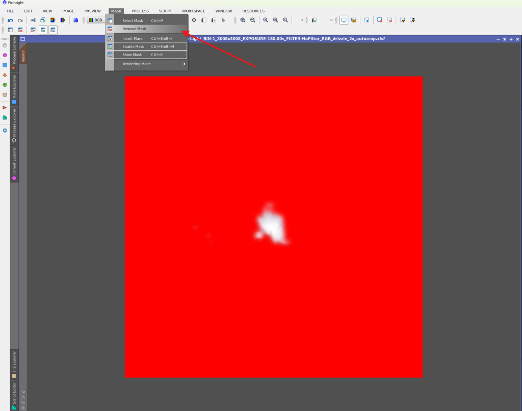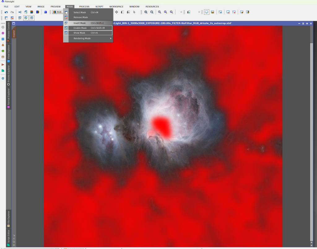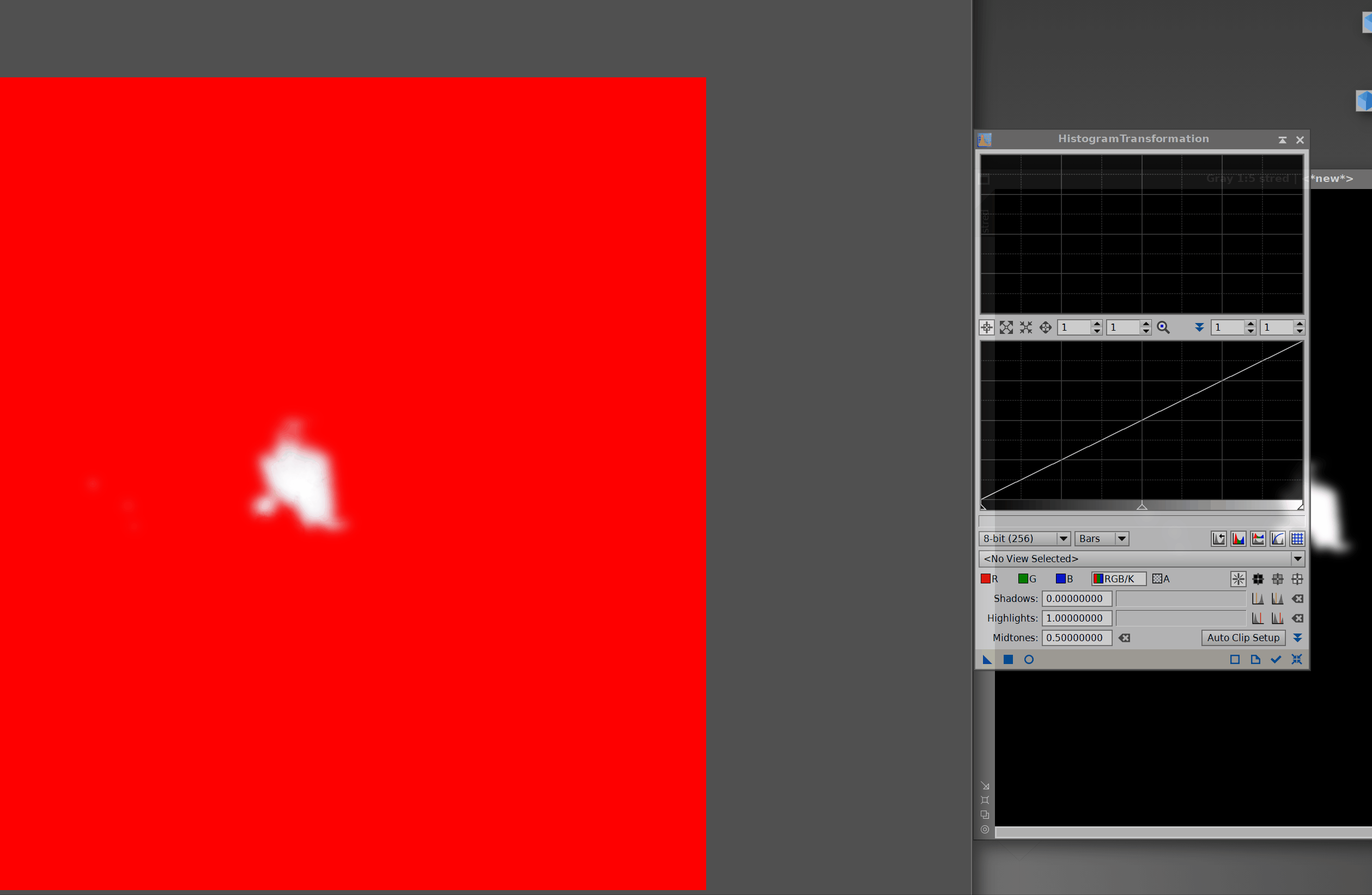 Bohužel, nám nebude stačit jedna maska na střed. Nyní tedy zavřeme preview okno, zavřeme HistogramTransformation, zrušíme a smažeme masku pro střed.