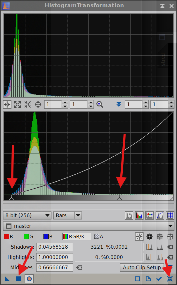 Jelikož chceme vybranou oblast ztmavovat, budeme histogram posouvat doprava. Doporučuji vždy posunout o malý kousek, kouknout je na preview, poté aplikovat, vyresetovat okno HistogramTransformation (tlačítko čtyř šipek vpravo úplně dole) a opět posunout o malý kousek, dokud nebudeme s výsledkem spokojeni. V histogramu manipulujeme s levou a prostřední šipkou a posouváme je doprava.