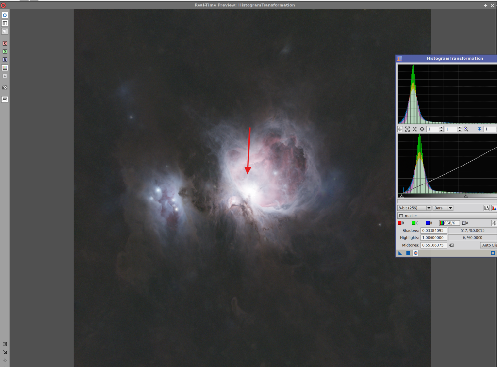 Aplikujte masku dle animace výše, je potřeba přetáhnout záložku z levého okraje okna masky do levého okraje okna obrázku, přesně tak jak je to v animaci. Poté otevřeme Process => <All processes> => HistogramTransformation. V okně vybereme náš obrázek, poté klikneme do prostoru obrázku a otevřeme preview kolečkem v levém dolním rohu, tak jako v minulém díle.